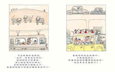 所以,當我看到《歐樂不這麼覺得!》繪本中,歐樂把老師展示給他看的字母A、a聯想成姿勢不同的大嘴鳥;W、w轉個方向,換個角度看,就變成一條條張大嘴巴的深海魚了。被姐姐說好無聊的乳牛、惱人的塞車陣、無趣的老舊船隻;在歐樂超能力──想像力的奔騰下,乳牛變成鼻子噴氣、頭上長尖角的野牛;旁邊平凡無奇的貨車頂上坐著海獅;貨車箱上還有三隻穿紅衣,表演疊羅漢的馬戲團老鼠;爸爸是個海盜,正開著載著大砲的海盜船,姐姐被綁在柱子上喊救命。
