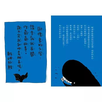 鯨老師寫了很多信,託海豹郵差送到水平線的那一邊。等啊等,等到他的學生企鵝都當上老師了,海豹郵差終於帶著回信回到鯨岬。