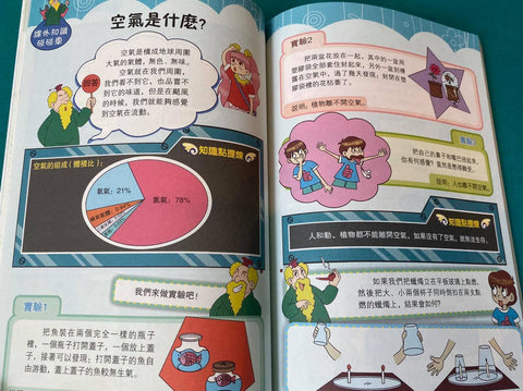 什麼是記憶金屬?肥皂是怎麼來的?電是什麼?遇到陌生人該怎麼辦?為什麼每個人的指紋都不一樣?新鮮空氣怎麼來的?超級彈力球?會寫字的冰塊?嘴中鹹蛋?透過漫畫的方式,輕鬆的讓小朋友認識與學習。